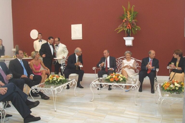 Από αριστερά προς δεξιά: Κώστας Καραμανλής, Νατάσα Παζαϊτη, Απόστολος Κακλαμάνης, Κωστής Στεφανόπουλος, Κώστας Σημίτης, Δάφνη Σημίτη και Αλέκα Παπαρήγα στην δεξίωση στο Προεδρικό Μέγαρο.