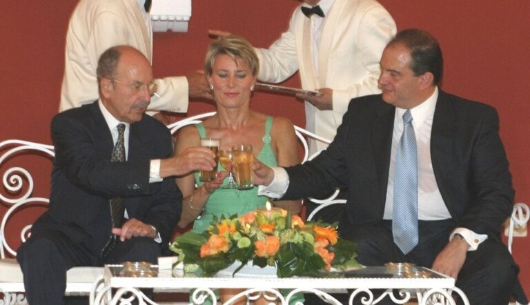 Ο πρωθυπουργός Κώστας Καραμανλής και η σύζυγός του, Νατάσα, «τσουγκρίζουν» τα ποτήρια τους με τον ΠτΔ.