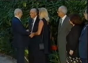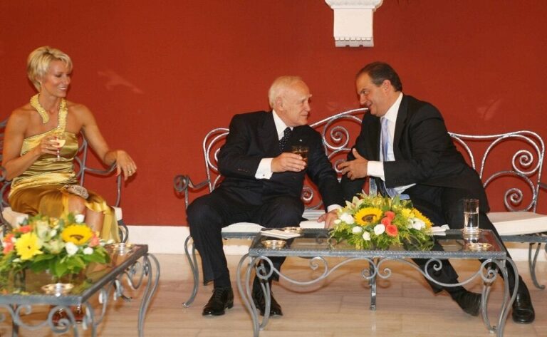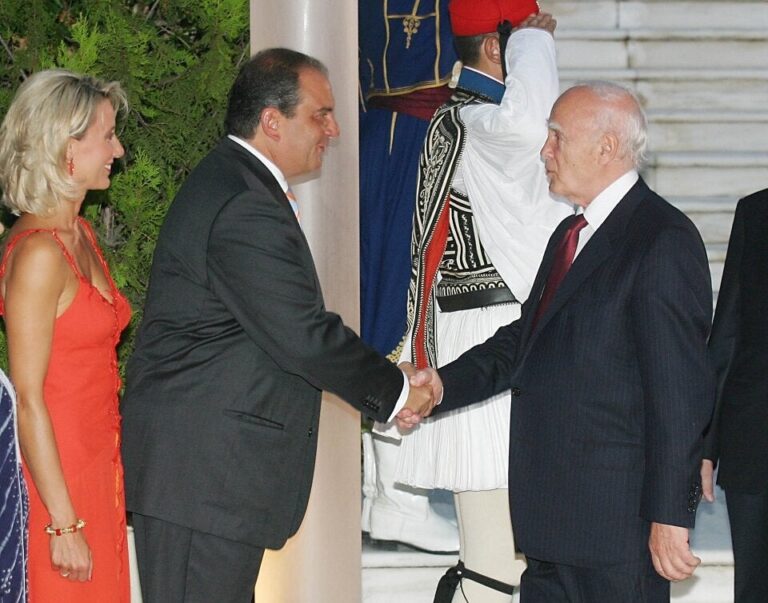 Ο Κωνσταντίνος Καραμανλής, χαιρετάει τον πρωθυπουργό εκείνης της περιόδου, Ανδρέα Παπανδρέου, και την τρίτη σύζυγό του, Δήμητρα Λιάνη.