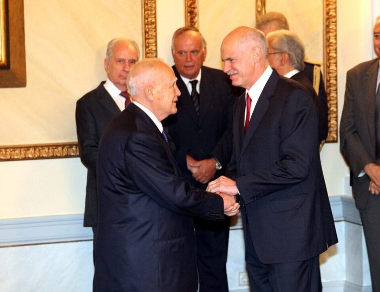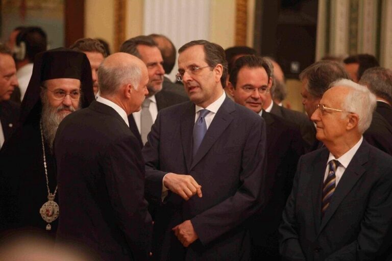 Ο πρωθυπουργός, Γιώργος Πανανδρέου, τα λέει με τον πολιτικό του αντίπαλο, Αντώνη Σαμαρά, και τον Χρήστο Σαρτζετάκη.