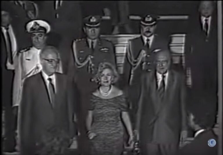 Ο Κωνσταντίνος Καραμανλής, χαιρετάει τον πρωθυπουργό εκείνης της περιόδου, Ανδρέα Παπανδρέου, και την τρίτη σύζυγό του, Δήμητρα Λιάνη.Youtube/ΣΤΙΓΜΙΟΤΥΠΑ ΑΠΟ ΤΗΝ ΠΟΛΙΤΙΚΗ ΖΩΗ ΤΗΣ ΧΩΡΑΣ