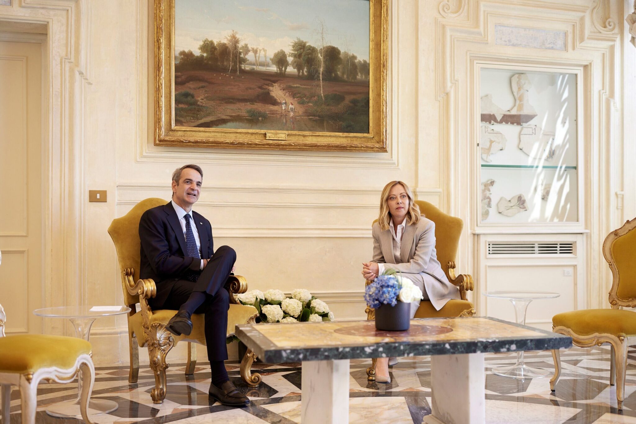 Τα πρώτα φωτογραφικά στιγμιότυπα, πριν από  την έναρξη της κατ′ ιδίαν συνάντησης του Πρωθυπουργού Κυριάκου Μητσοτάκη με την Πρωθυπουργό της Ιταλίας Τζόρτζια Μελόνι στη Ρώμη, προϊδεάζουν για πολύ φιλική ατμόσφαιρα.