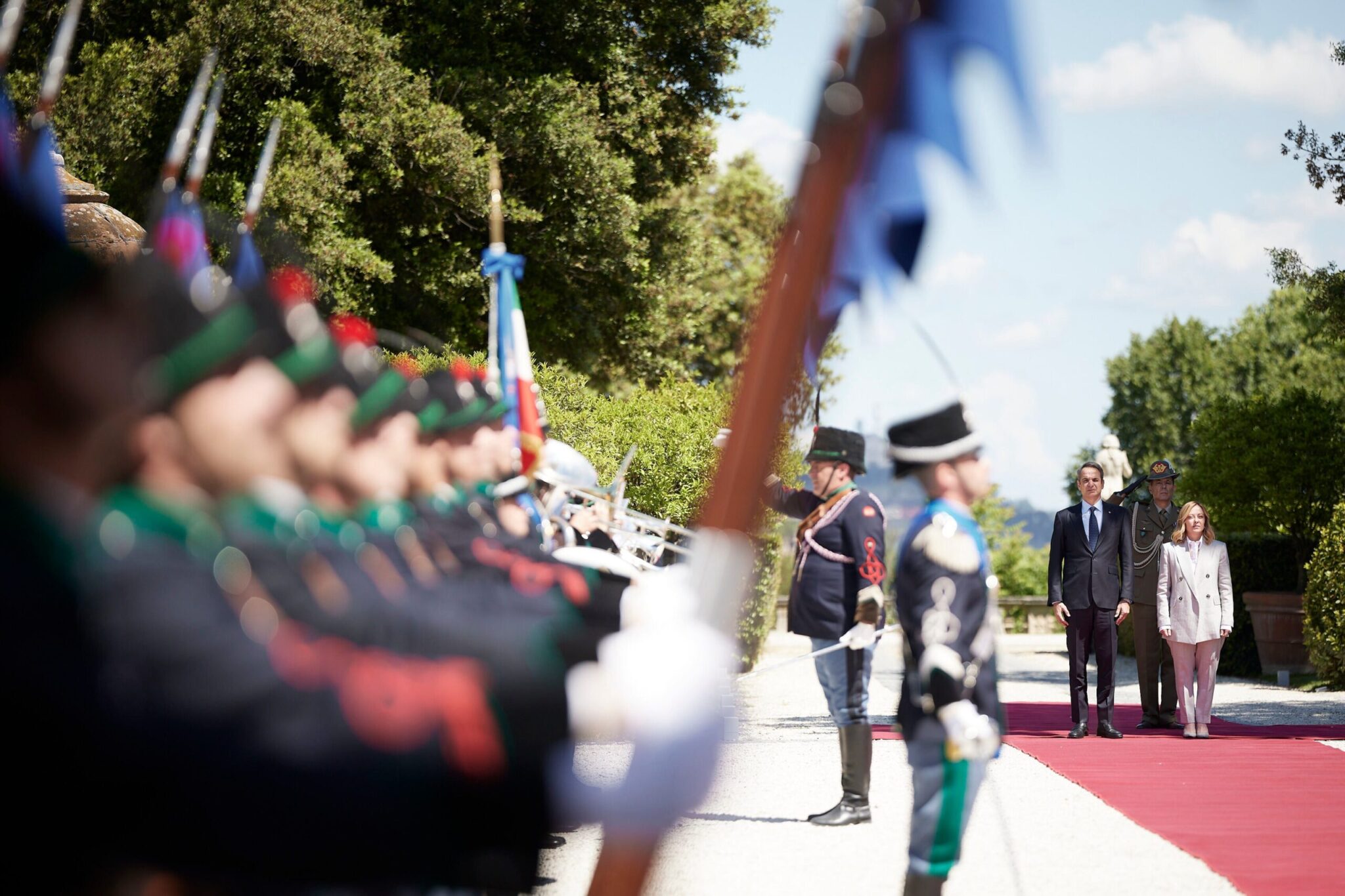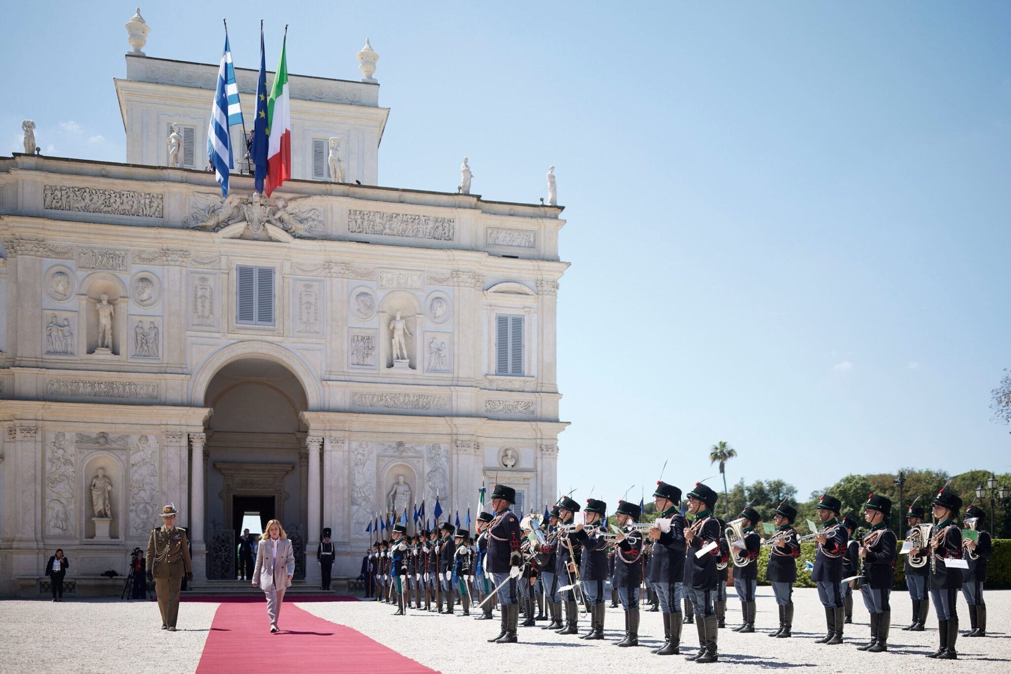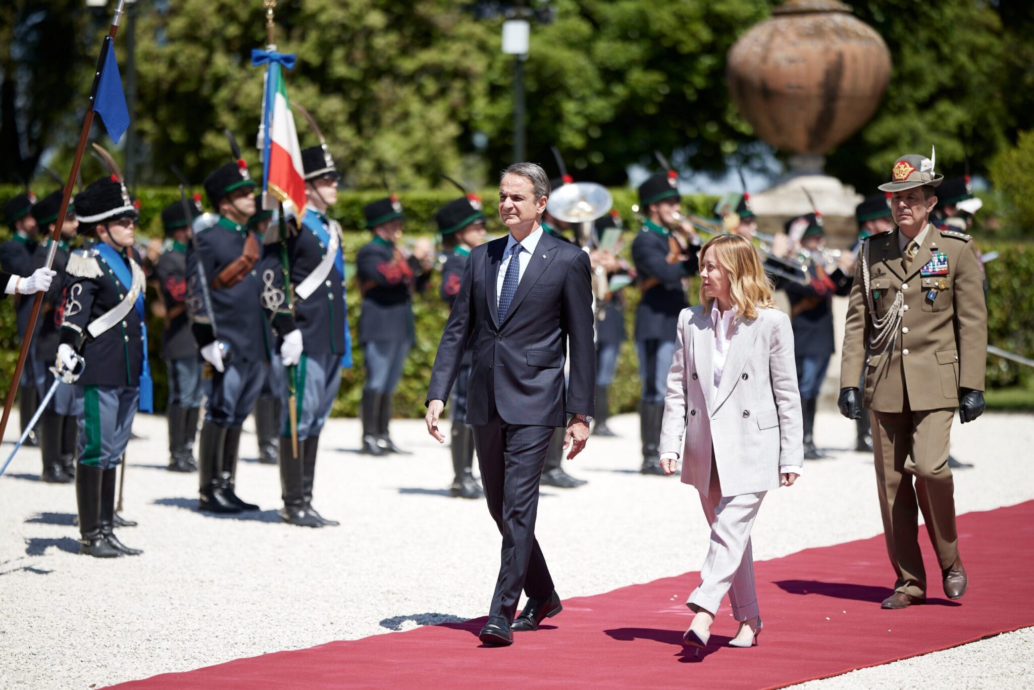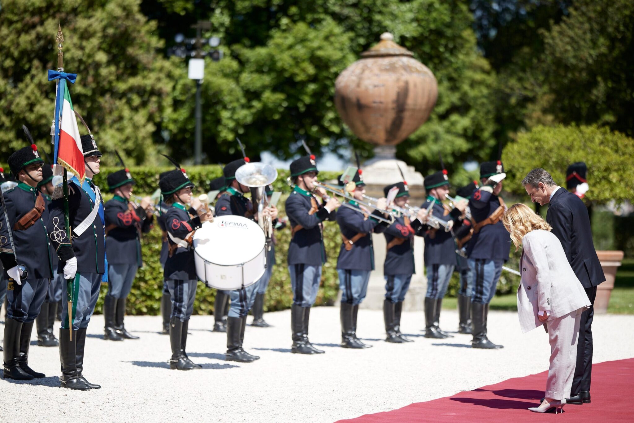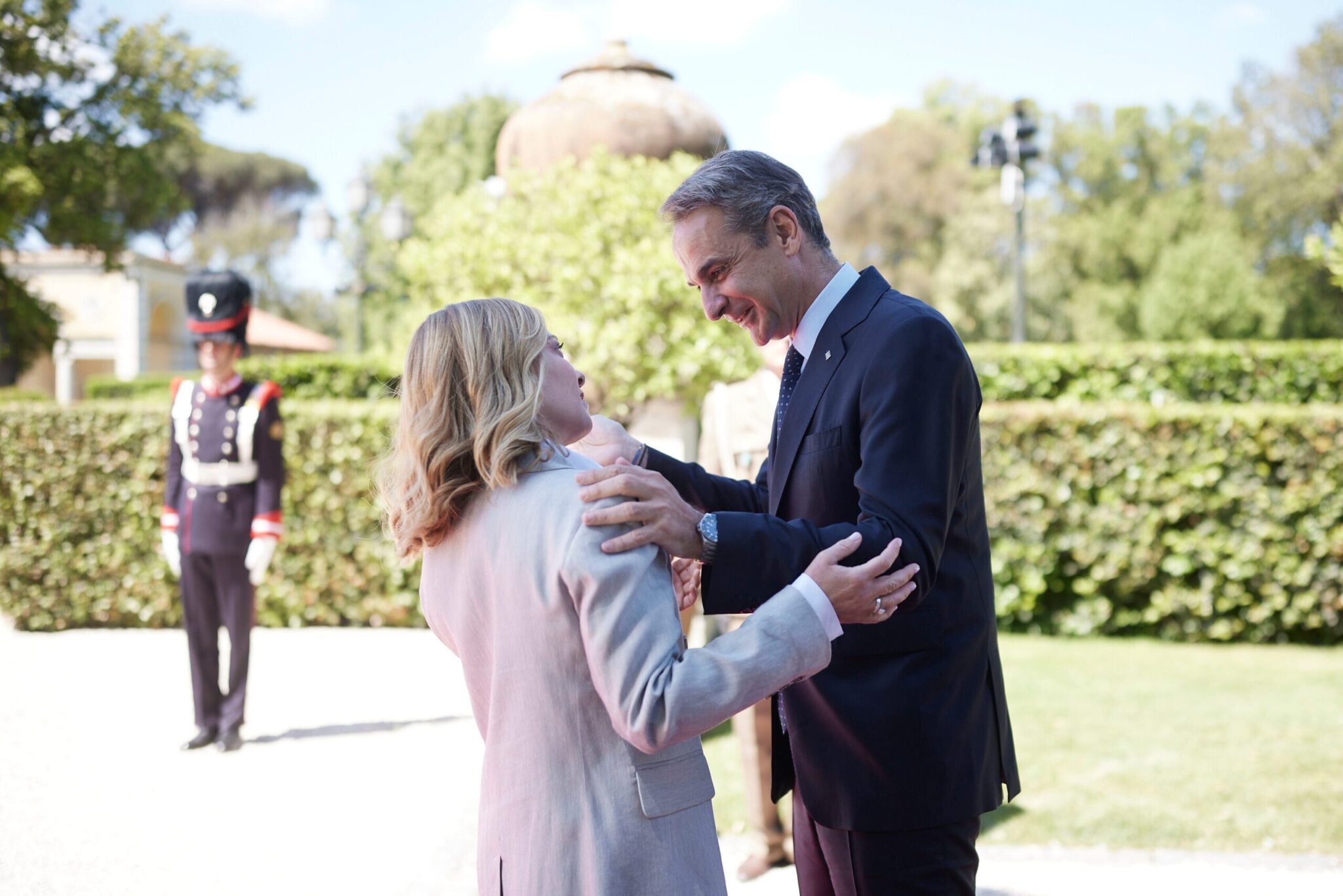 Βοηθούντος ενός λαμπερού ανοιξιάτικού ήλιου, η επίσημη υποδοχή από την κυρία Μελόνι στο κήπο του πρωθυπουργικού μεγάρου, όπου παρατάχθηκαν στρατιωτικά αγήματα, με την γαλανόλευκη να κυματίζει δίπλα στην ιταλική σημαία.