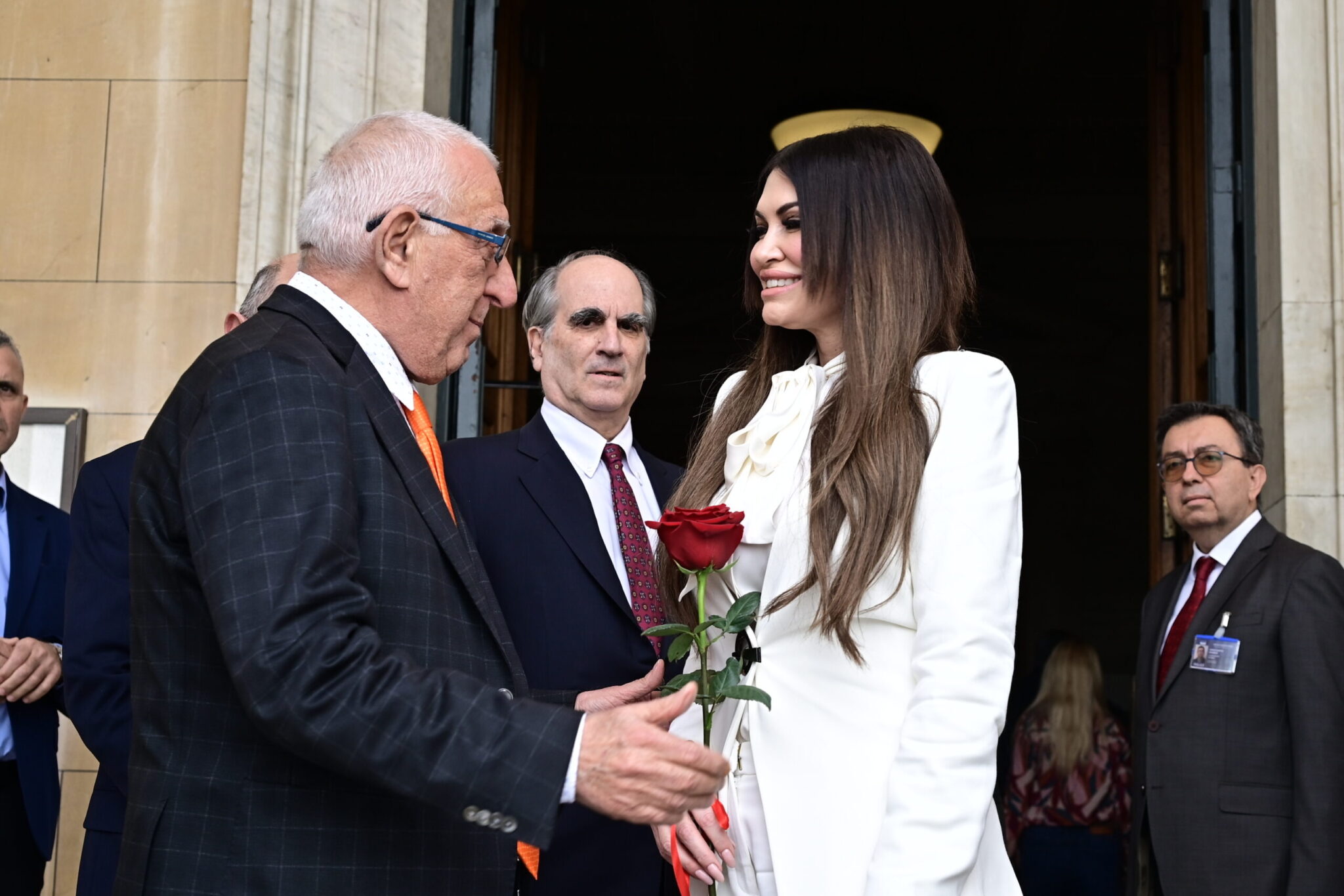 Στα πλάνα, στο βίντεο της HuffPost, η Κίμπερλι Γκίλφοϊλ διακρίνεται να κρατά στο χέρι της ένα εντυπωσιακό κόκκινο τριαντάφυλλο που της προσέφερε ιπποτικά ο κύριος Κακλαμάνης, ενώ φορά λευκό κοστούμι.
