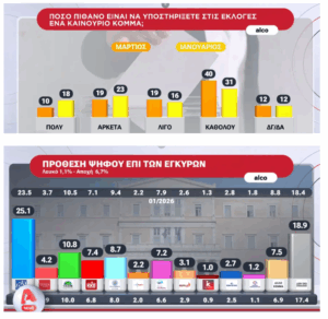Πέραν της ΝΔ, άνοδο σημειώνουν το ΠΑΣΟΚ, το ΚΚΕ και ο ΣΥΡΙΖΑ, ενώ πτώση εμφανίζουν η Ελληνική Λύση και η Πλεύση. Την ίδια στιγμή, αυξήθηκε στο 18,9% από 18,4% το ποσοστό των αναποφάσιστων, ενώ μειώνεται το ποσοστό εκείνων που προτίθενται να ψηφίσουν ένα καινούργιο κόμμα. Η απάντηση «πολύ πιθανόν να ψηφίσω» έπεσε από το 18% τον Ιανουάριο, στο 10% σήμερα.