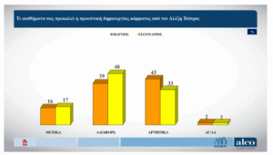 Για το κόμμα Καρυστιανού, τον Ιανουάριο το 26% δήλωνε ότι θετικά συναισθήματα – σήμερα αυτά είναι στο 22%. Αντίστοιχα, για το κόμμα Τσίπρα, τα θετικά συναισθήματα έπεσαν από το 17% στο 16%. Πάντως, ένας στους δύο δηλώνει ότι δεν υπάρχει κάποιο κόμμα που να τον εκφράζει «σε σημαντικό βαθμό», ενώ το 67% δηλώνει ότι δεν έχει περιοριστεί η ακρίβεια στην αγορά.