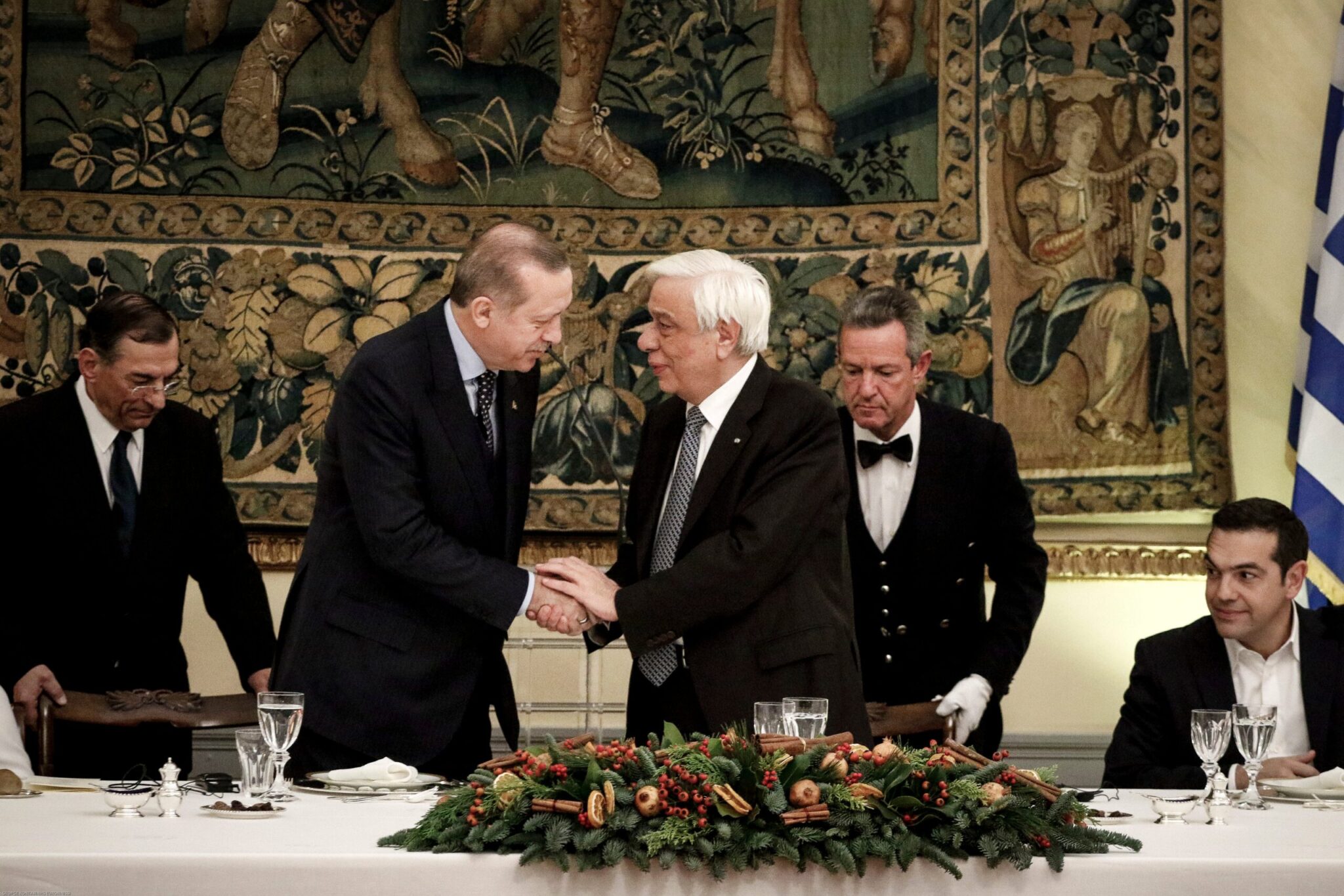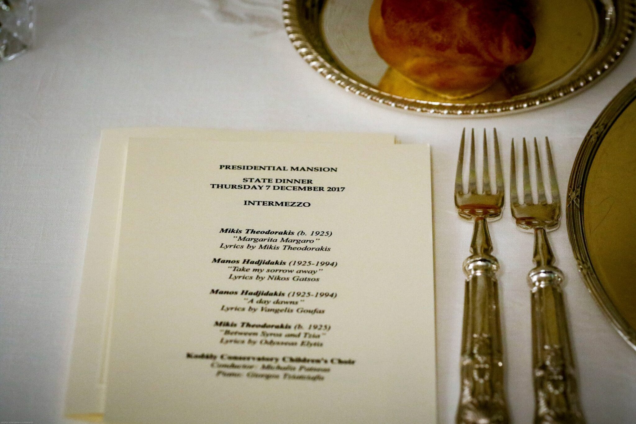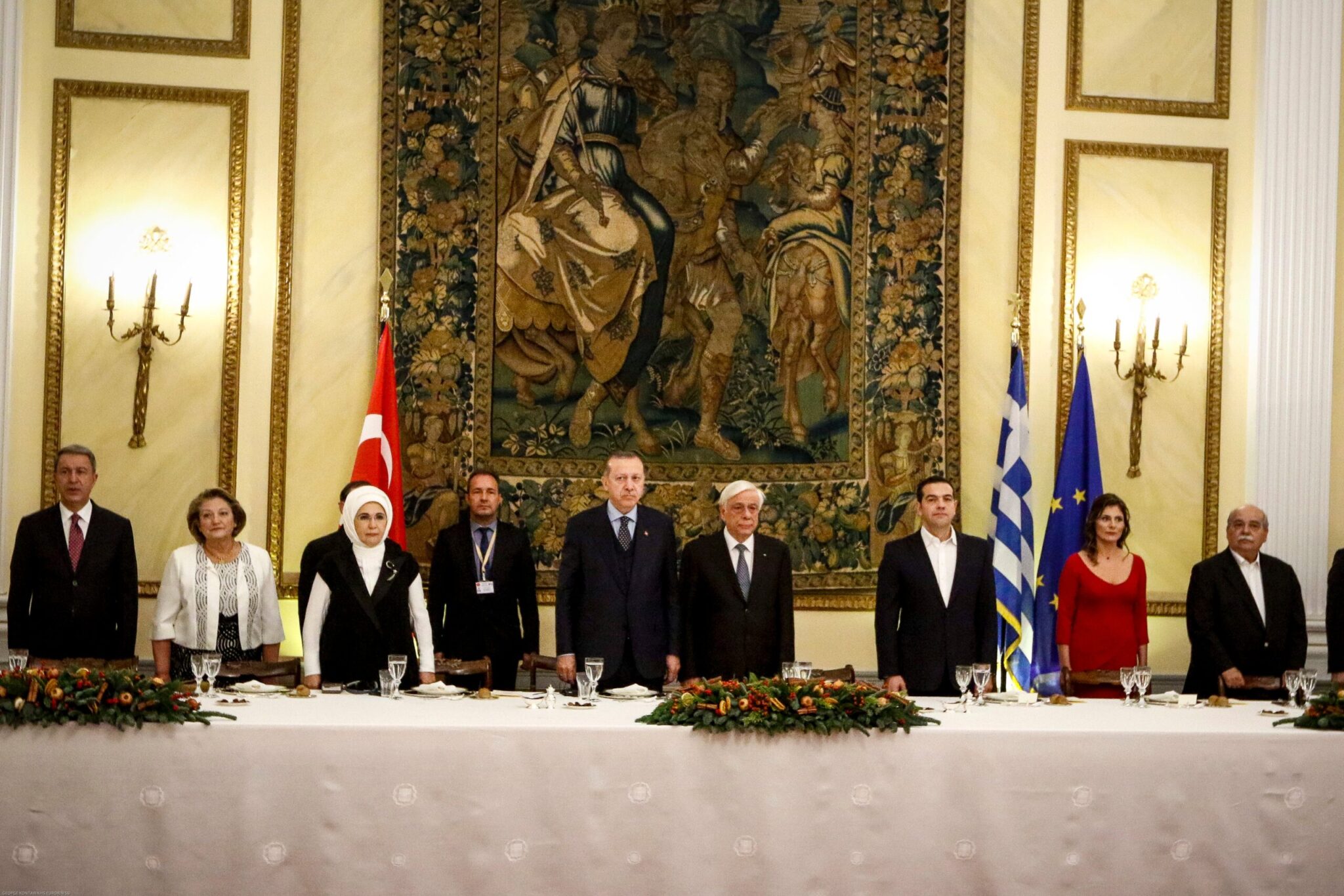 Γαρίδες με εσπεριδοειδή, χόρτα με σελινόριζα, φιλέτο σφυρίδα γαρνιρισμένο με λαχανικά ατμού, φρούτα εποχής και καφέ… τράταρα τον Τούρκο πρόεδρο Ρετζέπ Ταγίπ Ερντογάν, και την σύζυγό του, Εμινέ Ερντογάν, στο επίσημο δείπνο που παρατέθηκε προς τιμήν του στο Προεδρικό Μέγαρο.