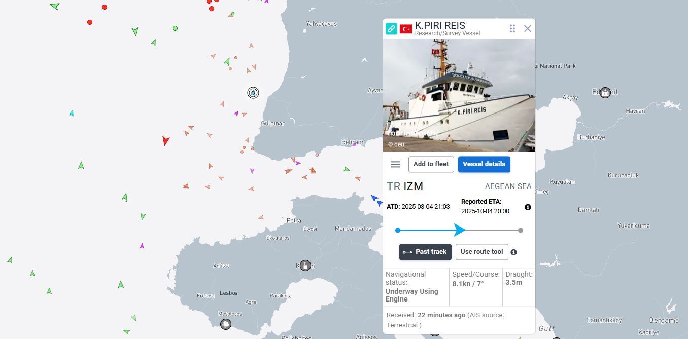 Βόρεια της Λέσβου και κοντά στις τουρκικές ακτές φαινόταν, σύμφωνα με ανοικτές πηγές, να κινείται το πρωί του Σαββάτου το τουρκικό ωκεανογραφικό «Πίρι Ρέις», που απέπλευσε από το λιμάνι της Σμύρνης το βράδυ της Παρασκευής.