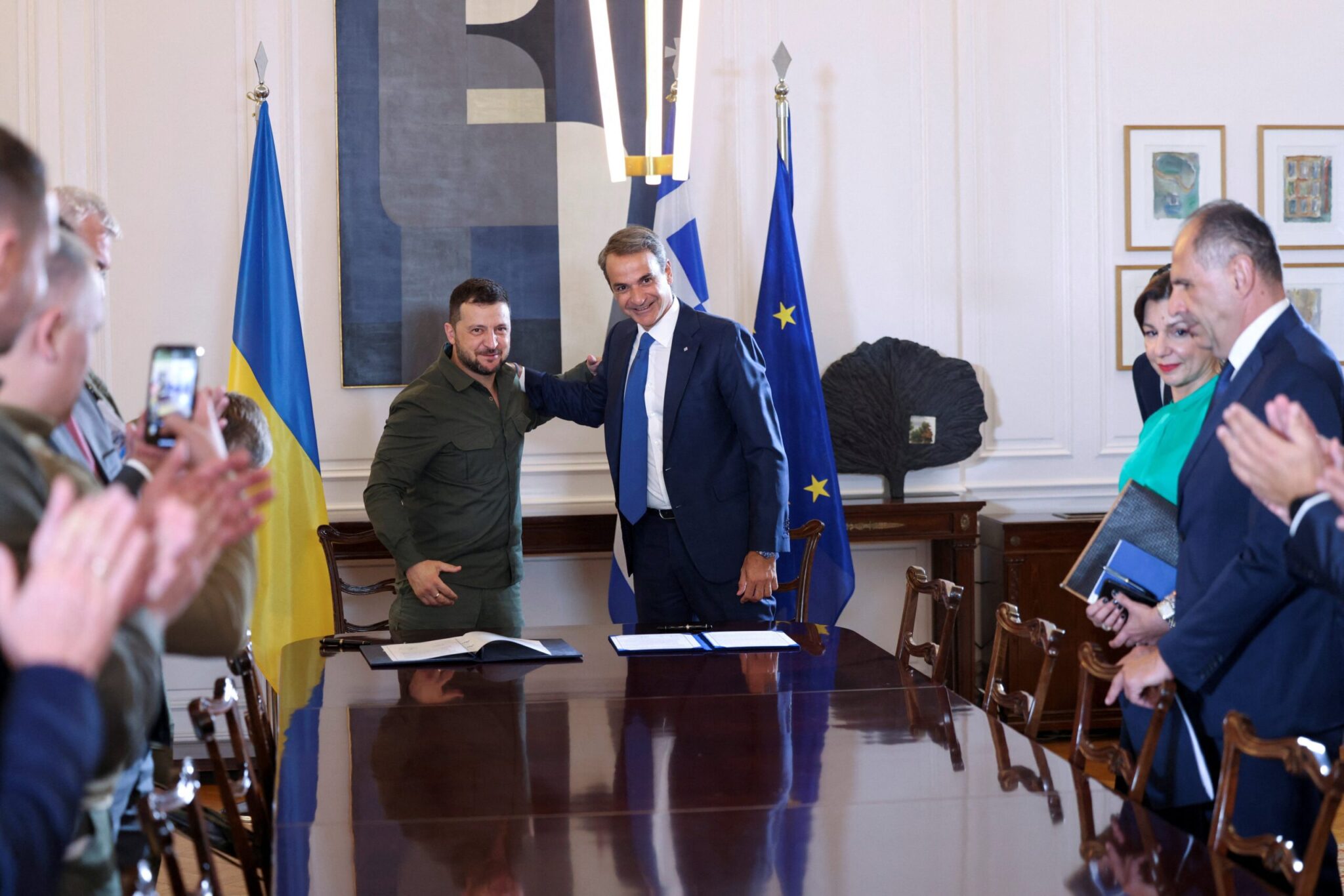 «Σήμερα έχουμε ένα σημαντικό αποτέλεσμα για τον αεροπορικό συνασπισμό. Η Ελλάδα θα συμμετέχει στην εκπαίδευση των πιλότων μας για τα F-16. Είμαι ευγνώμων για αυτή την πρόταση» είπε ο Ζελένσκι κατά τη συνέντευξη Τύπου με τον Έλληνα πρωθυπουργό, Κυριάκο Μητσοτάκη.