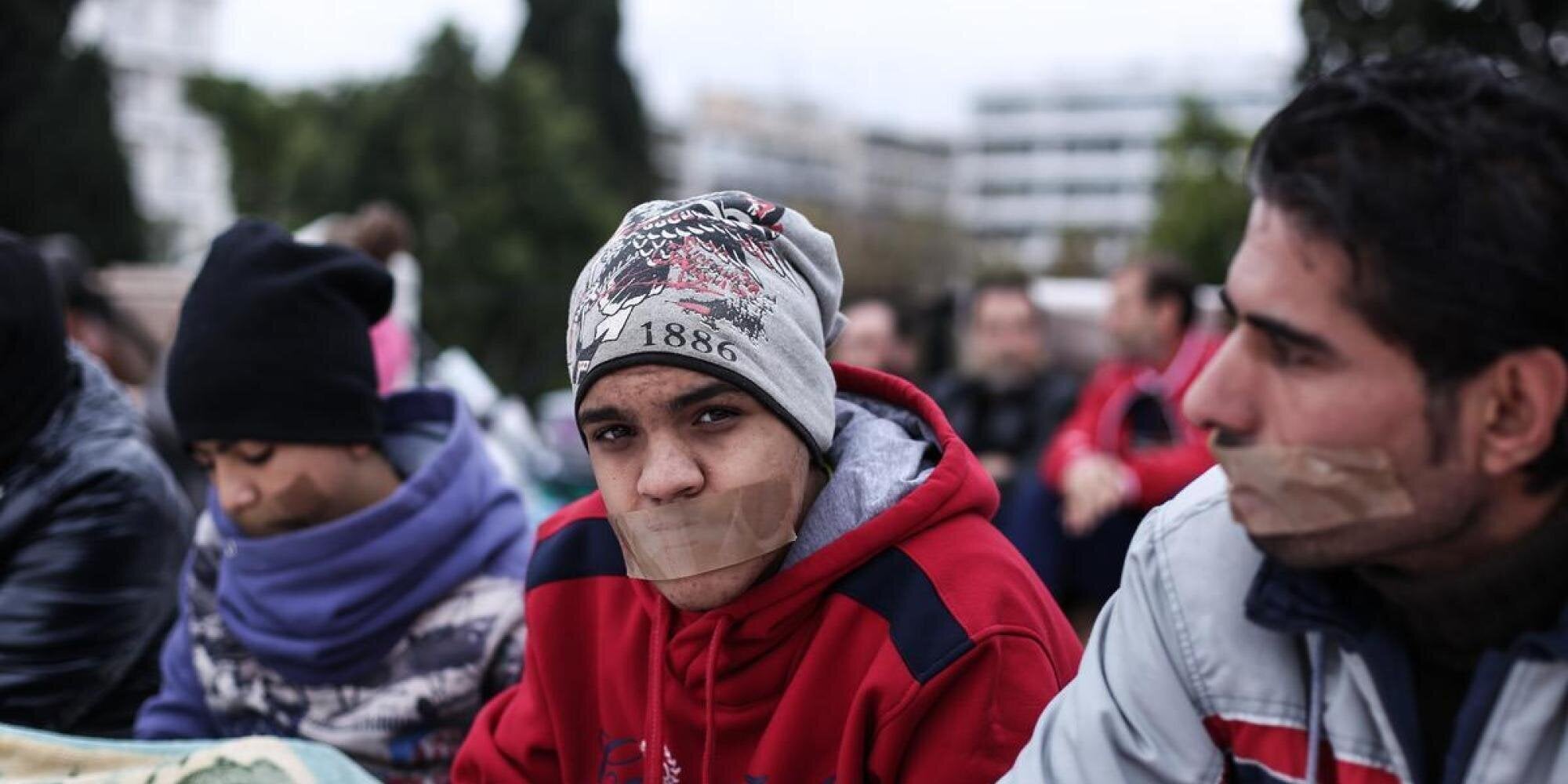 Συγκέντρωση διαμαρτυρίας Σύριων στο Σύνταγμα. Έκλεισαν τα στόματα τους με ταινίες