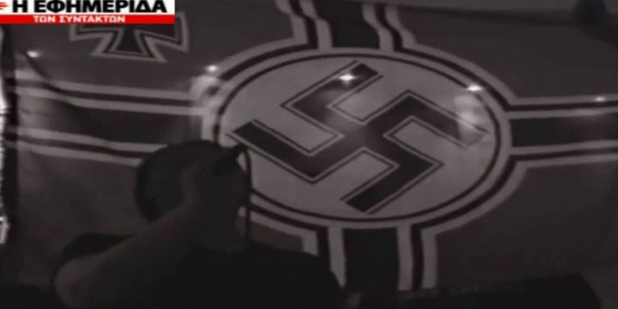 Χρυαυγίτες ψέλνουν τον ύμνο της ναζιστικής Γερμανίας με φόντο την σημαία του Τρίτου Ράιχ