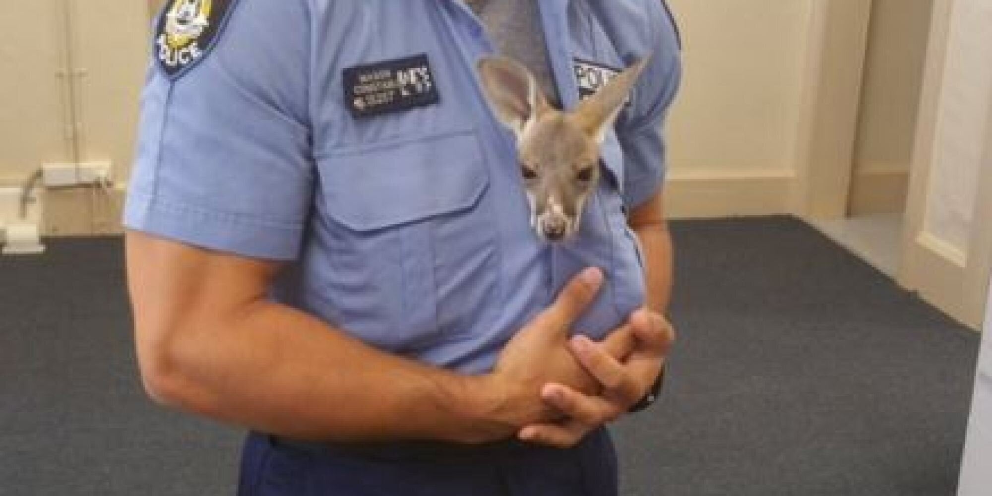 Αυτό το αξιαγάπητο ορφανό καγκουρό νομίζει ότι το μπλουζάκι του αστυνομικού είναι ο μάρσιπος της μαμάς του