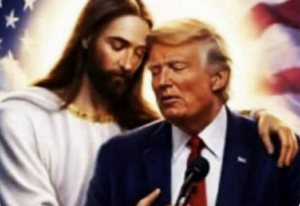 Η εικόνα, που αναδημοσιεύτηκε στον λογαριασμό του Τραμπ στο Truth Social, τον δείχνει με τα μάτια του κλειστά, να κλίνει την κεφαλή προς τον Ιησού. Ο Τραμπ στέκεται πίσω από ένα μικρόφωνο και πίσω του μια αμερικανική σημαία. Η αρχική ανάρτηση είχε τη λεζάντα: «Δεν ήμουν ποτέ ένας ιδιαίτερα θρησκευόμενος άνθρωπος… αλλά δεν φαίνεται, με όλα αυτά τα σατανικά, δαιμονικά, τέρατα που θυσιάζουν παιδιά να αποκαλύπτονται… ότι ο Θεός μπορεί να παίζει το χαρτί Τραμπ!»