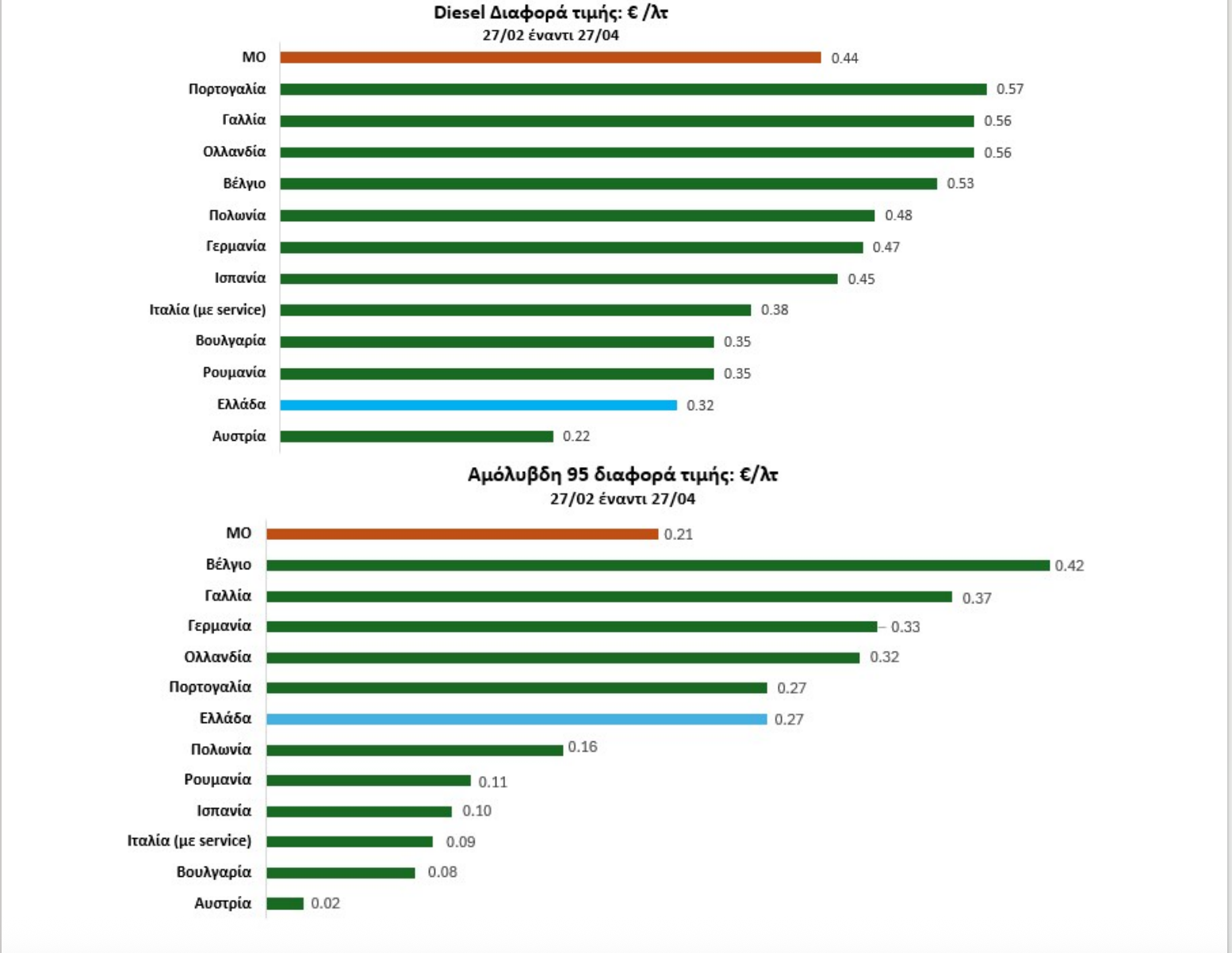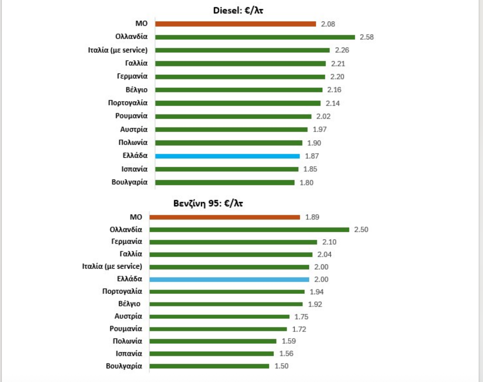 Παράλληλα, η σύγκριση των απόλυτων τιμών δείχνει ότι η Ελλάδα βρίσκεται σε σχετικά καλή θέση, στο diesel καταγράφει την τρίτη χαμηλότερη τιμή στην Ευρωζώνη, ενώ στη βενζίνη παραμένει κοντά στον μέσο όρο . Η Ελλάδα βρίσκεται κάτω από χώρες όπως η Ολλανδία, η Γαλλία και η Γερμανία, τόσο ως προς τις αυξήσεις όσο και ως προς τα επίπεδα τιμών.